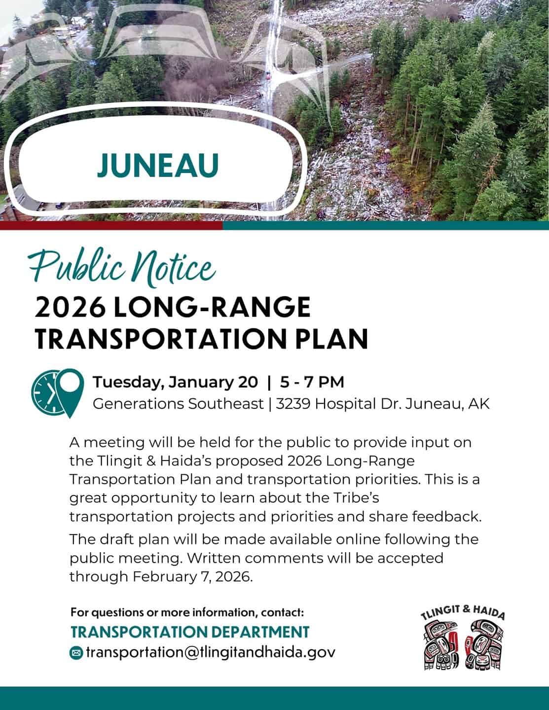 Tlingit & Haida’s Transportation Department invites tribal citizens and the general public to attend a community meeting to provide input on the Tribe’s proposed 2026 Long Range Transportation Plan and transportation priorities.