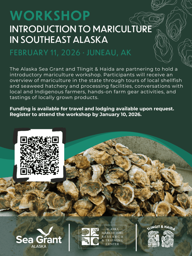 The Alaska Sea Grant and Tlingit & Haida are partnering to hold a introductory mariculture workshop. Participants will receive an overview of mariculture in the state through tours of local shellfish and seaweed hatchery and processing facilities, conversations with local and Indigenous farmers, hands-on farm gear activities, and tastings of locally grown products.