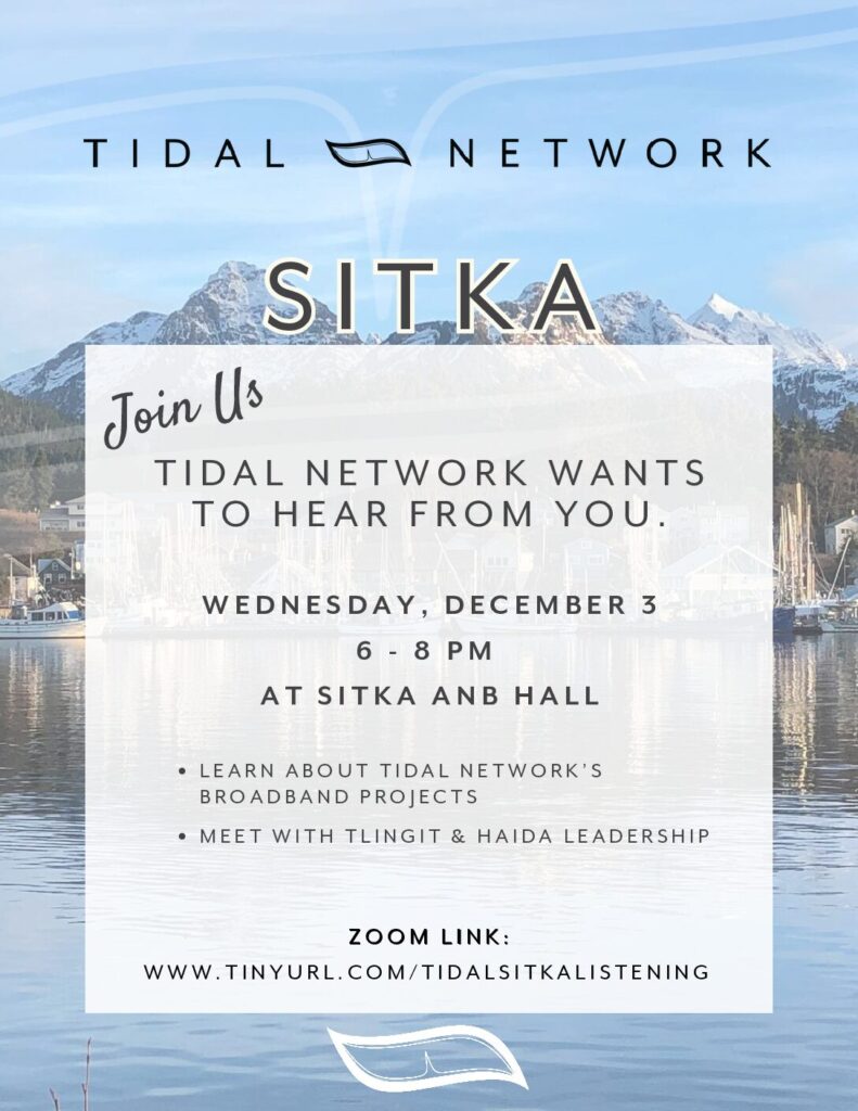 Tlingit & Haida and Tidal Network invite you to upcoming community meetings in seven Southeast Alaska communities. These listening sessions are a chance to hear updates on the Tidal Network and share your perspective on local connectivity needs.