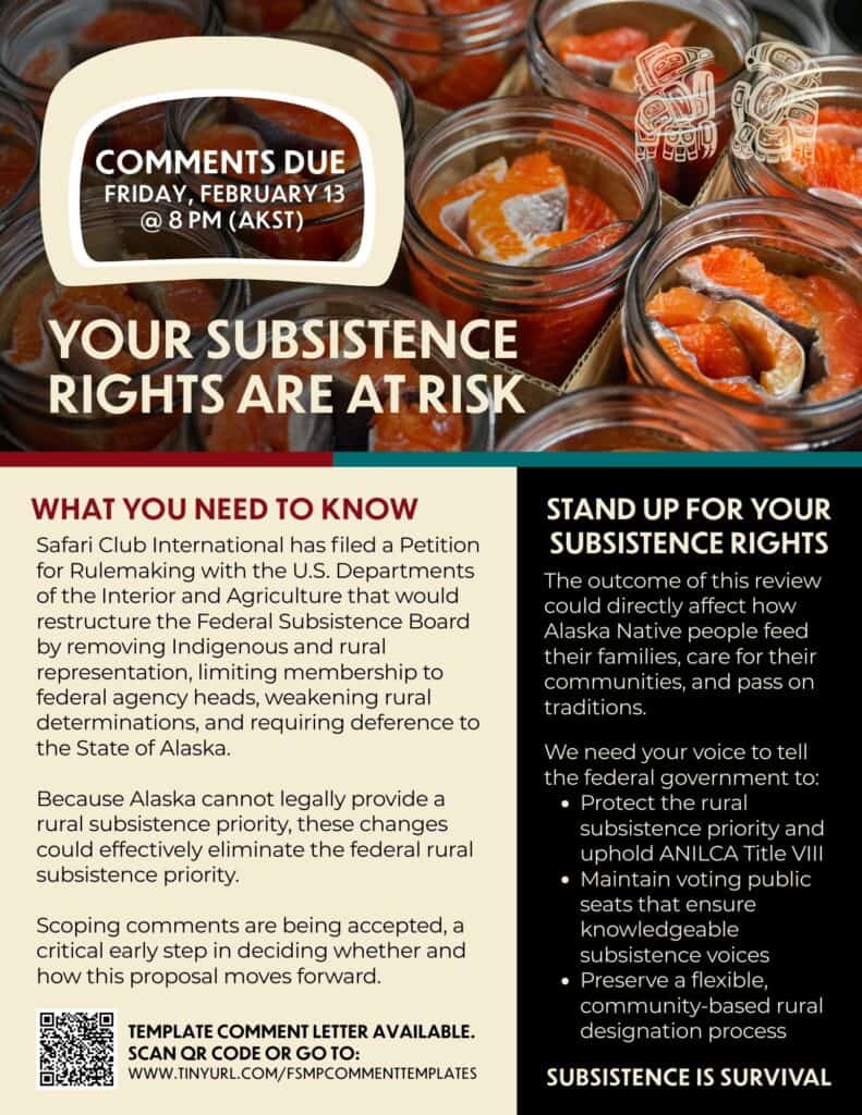 Your voice matters. Please take a moment to submit comments to help protect subsistence for current and future generations. Template comment letter is available to download through link below.